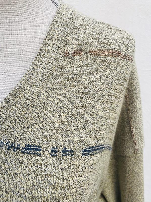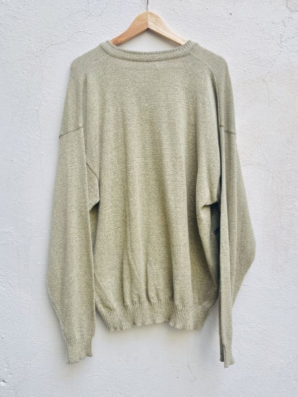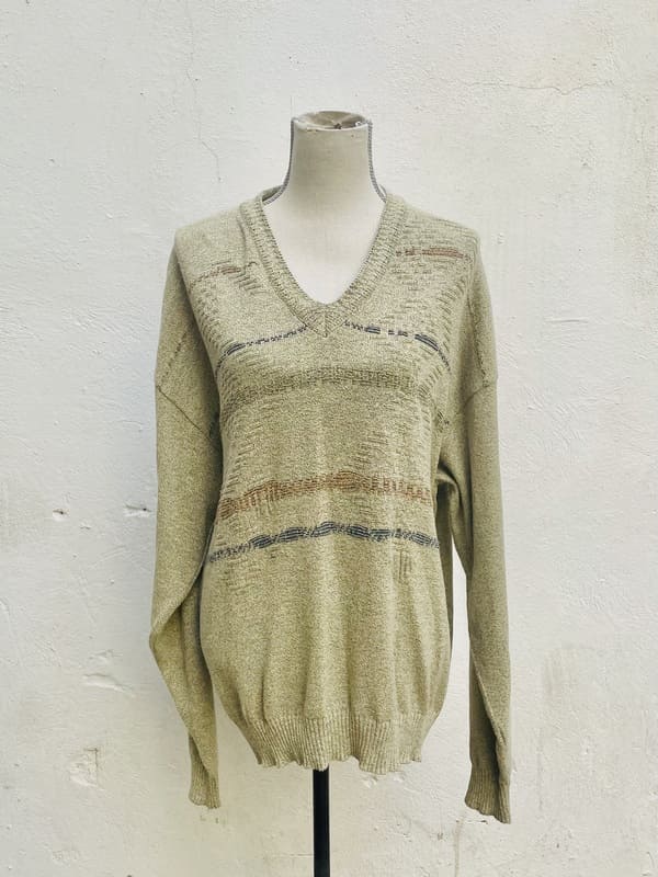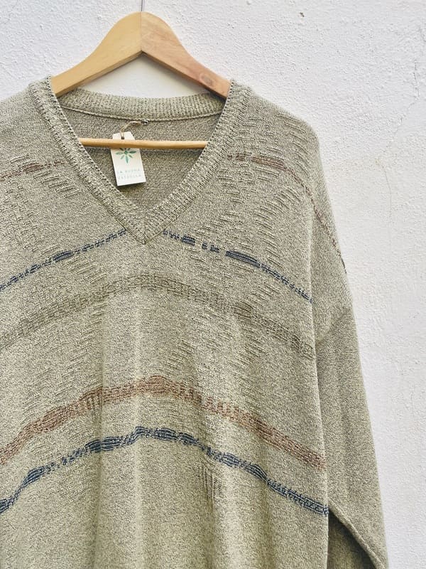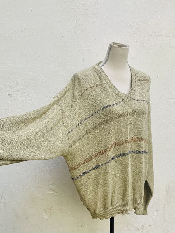 Jersey vintage oversize de punto de los años ochenta. De color beige jaspeado con líneas horizontales en tonos pastel. De forma amplia, recta y holgada. Cuello de pico. Punto en mezcla de acrílico. En perfecto estado.
