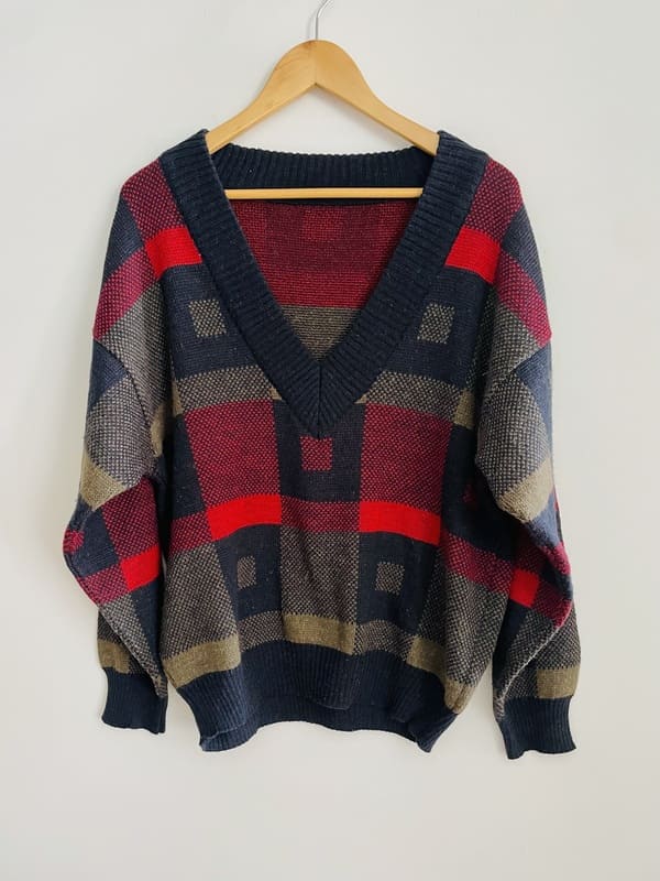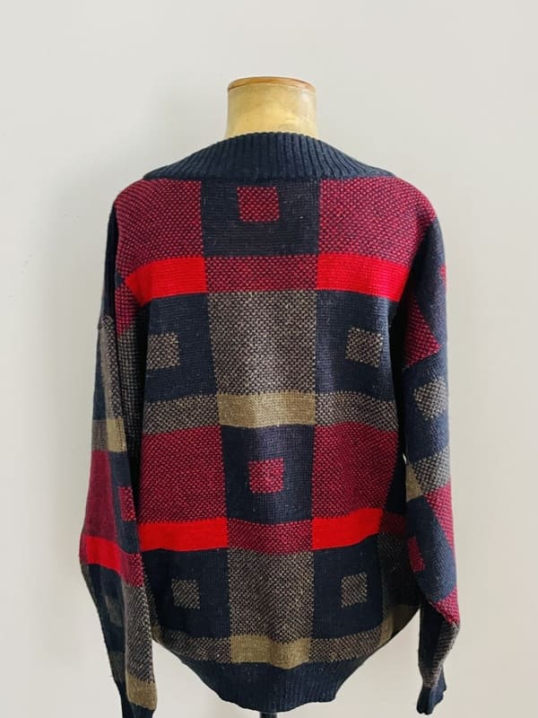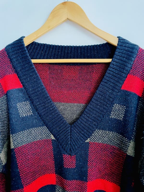Jersey vintage de punto, amplio y holgado, de la marca Schiesser. Composición: 50% lana y 50% poliacrílico. De color negro, marrón y rojo con cuello de pico. Impecable, como nuevo.