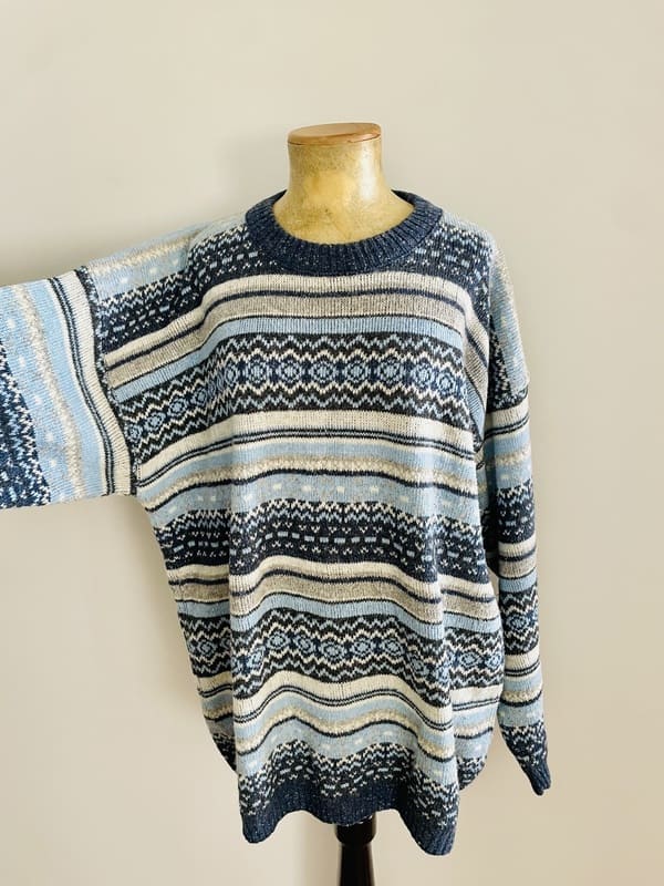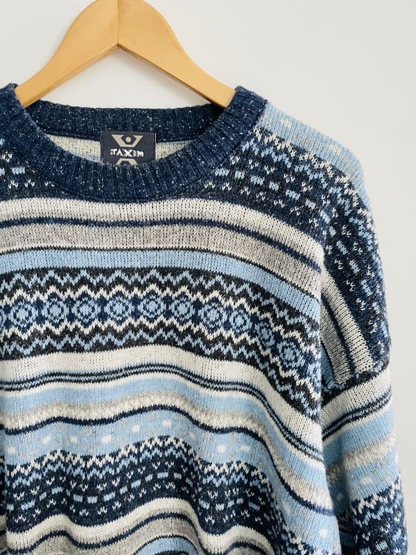 Jersey vintage de la marca Taxim. A cenefas horizontales en tonos azules. Composición: 30% lana, 12% algodón, 51% poliacrílico y 7% otras fibras. De forman recta con cuello redondo cerrado. Impecable, como nuevo.