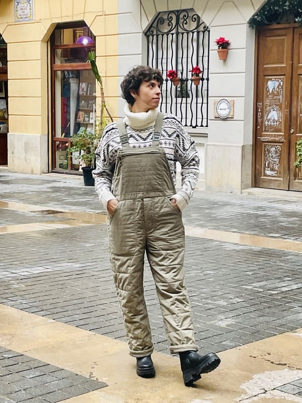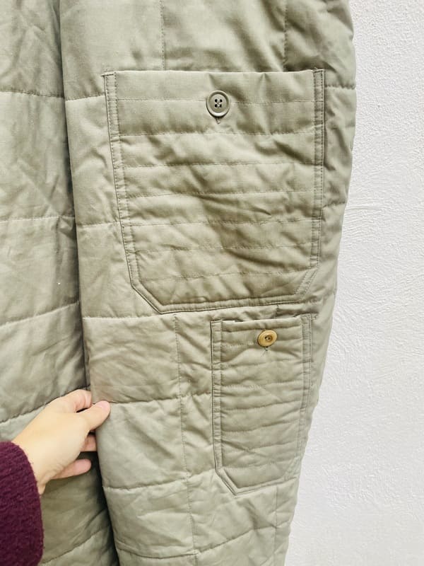 Mono vintage acolchado de color beige de la marca Atlas. Composición: 35% algodón y 65% poliéster, con forro interior 100% poliamida. De forma recta y corte oversize, con tres bolsillos delanteros y dos traseros. Tirantes ajustables. En perfecto estado.