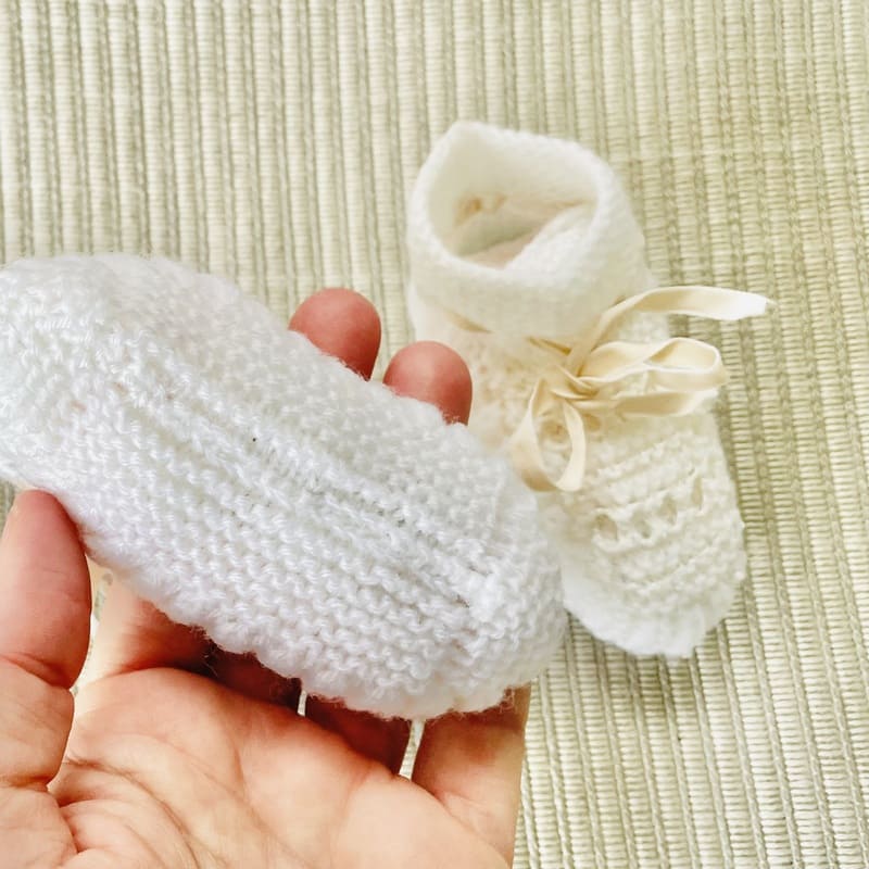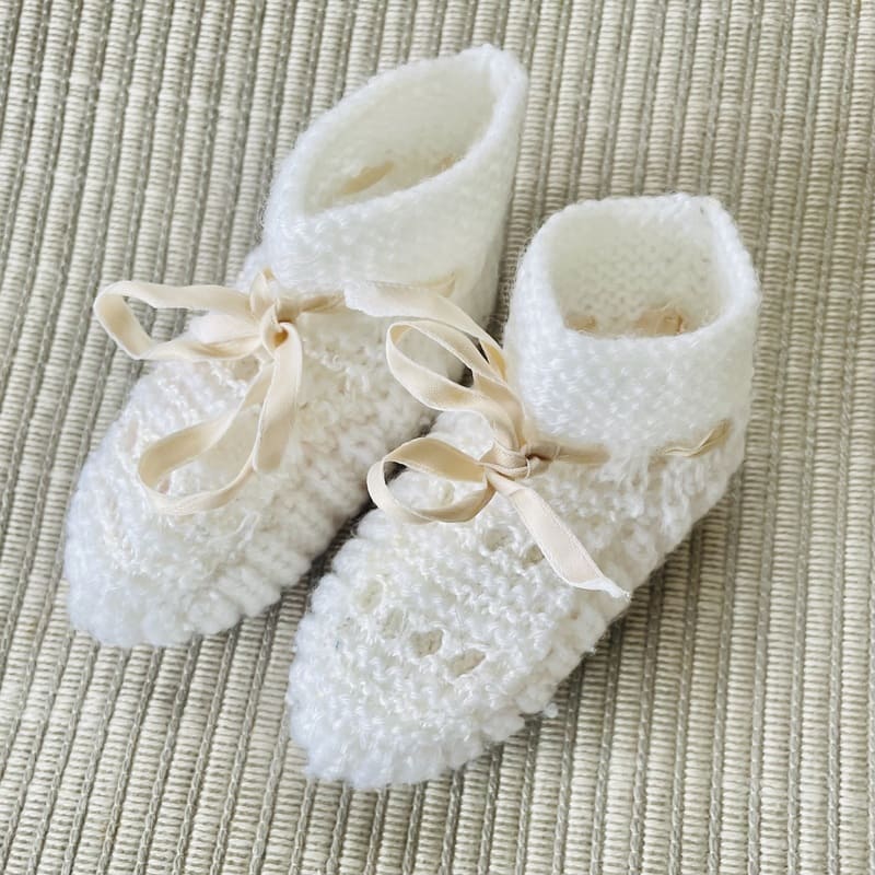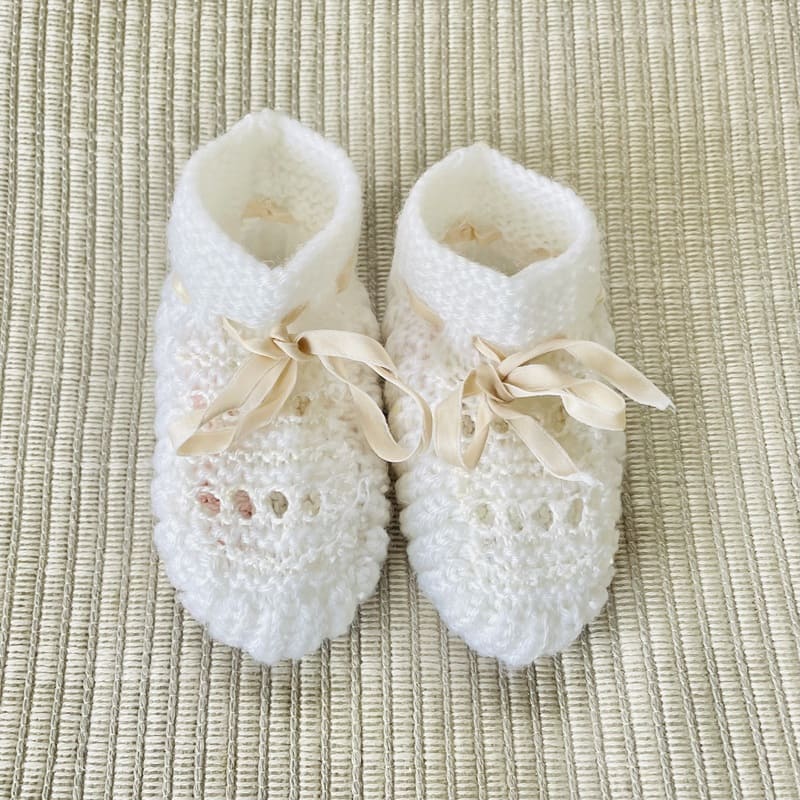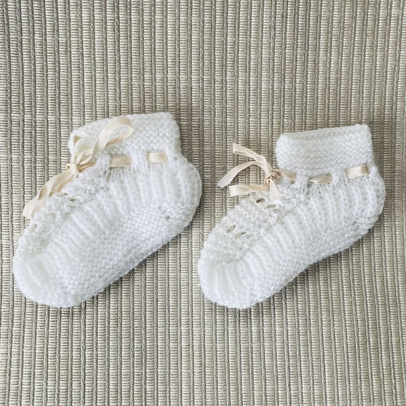 Patucos vintage para bebé. Tejidos a mano en punto muy suave de color blanco, con detalle de cinta de raso en color nude con lazada en el tobillo. Impecables.
