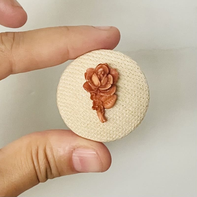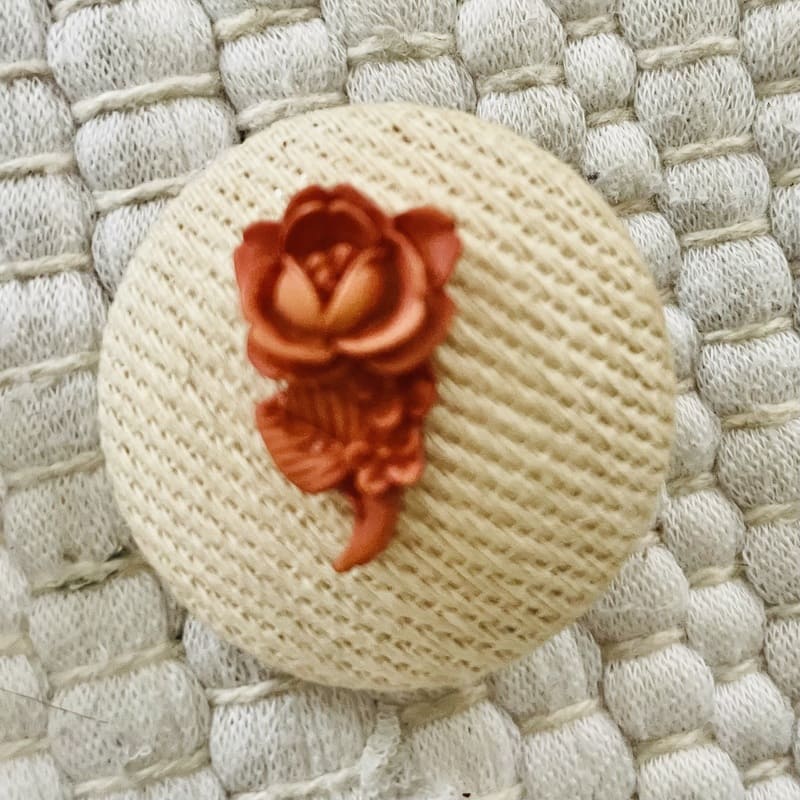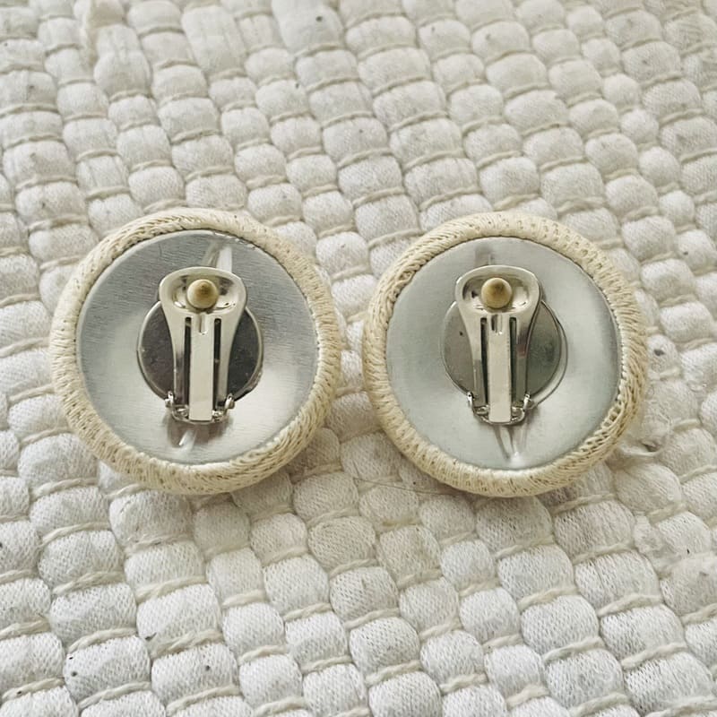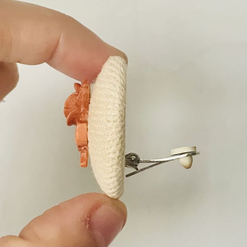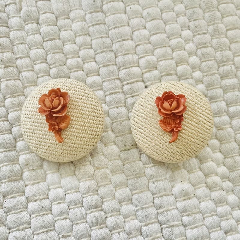 Pendientes vintage de pinza/clip. Nuevos, antiguo stock de los años 60. Revestidos en tela beige con una flor color teja en relieve en el centro. Cierre metálico en plateado. Impecables.