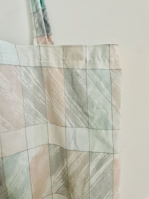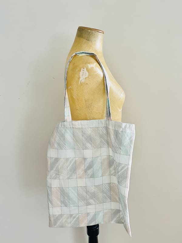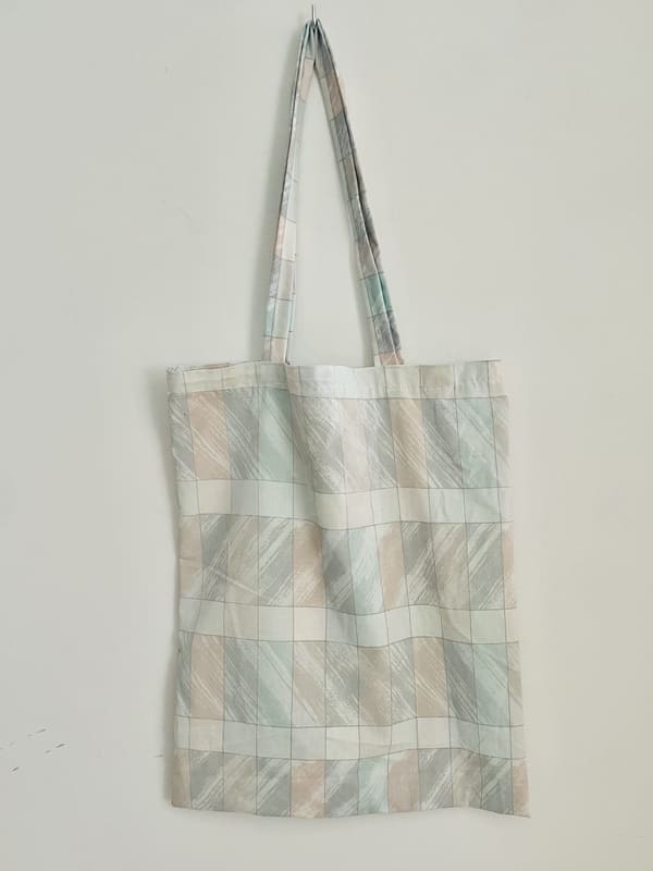 Tote bag handmade hecha con retales vintage. En tonos fríos pastel formando rectángulos. Medidas: 42 cm de alto x 37 cm de ancho, asa 27 cm de alto.
