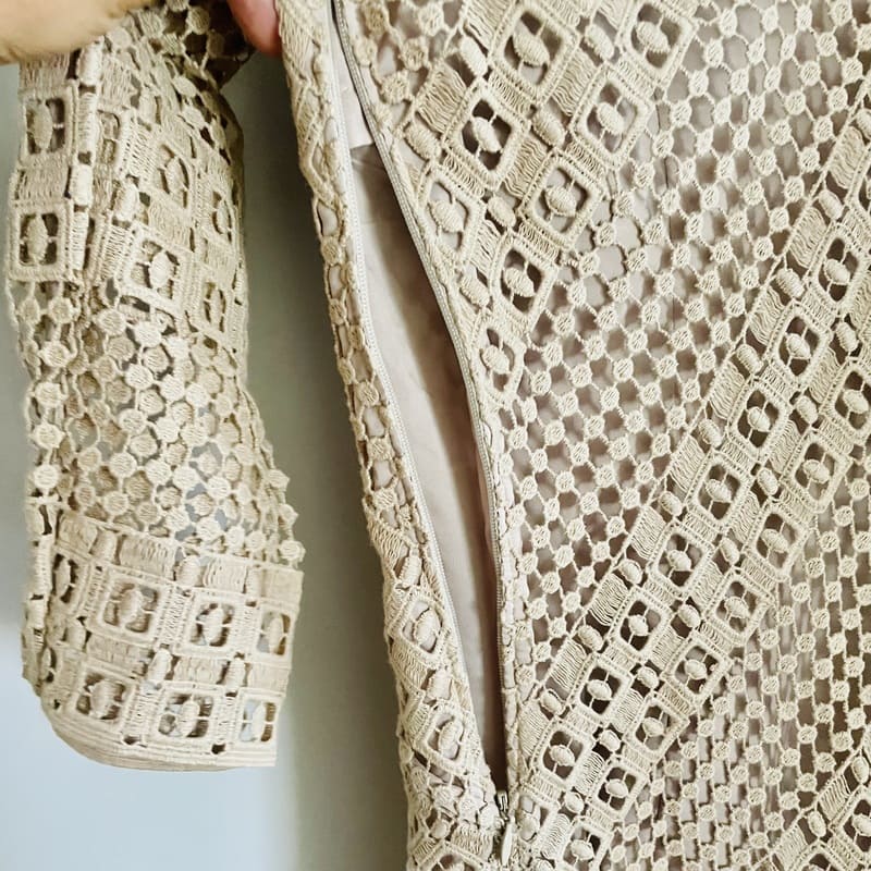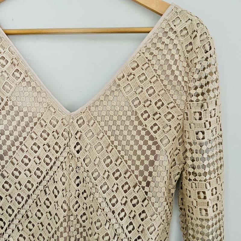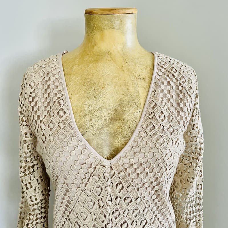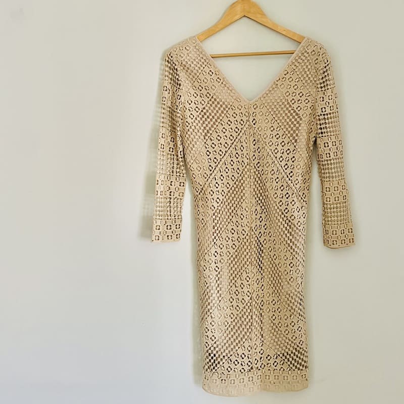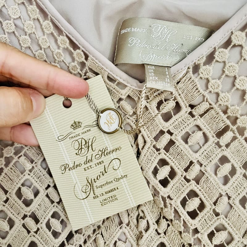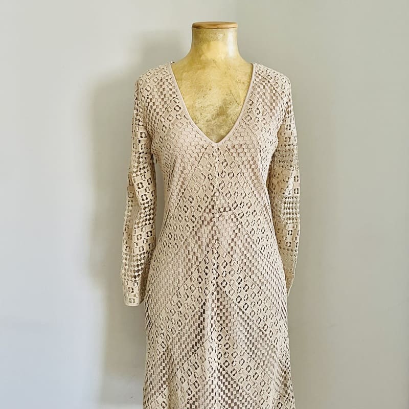 Vestido nuevo de Pedro del Hierro Sport de Edición Limitada. Tejido calado y de color beige champagne de algodón 100% y forro de poliéster en el mismo color. De manga larga, escote en V y de forma recta con mucha caída. Conserva su etiqueta original (precio en tienda de 159 €). Perfecto e impecable