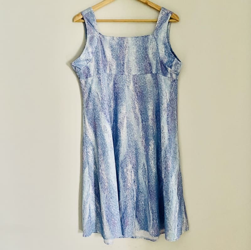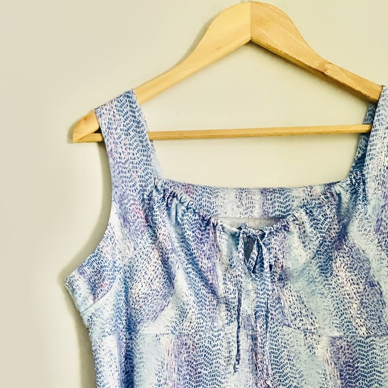 Vestido vintage midi de los años 70. De tirantes anchos y escote fruncido de cortinilla. Ajustado en el pecho y bajo pecho y suelto de cuerpo. De poliéster fino y fresco, no precisa planchado. En tonos azules. En perfecto estado.